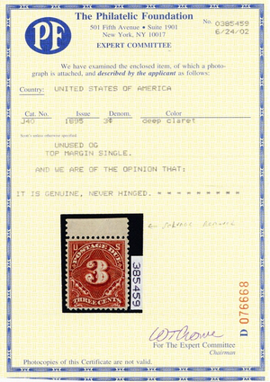 Due to the high cost of obtaining certificates we will only refund the cost of the stamp and not the cost of the certificate for stamps that sell for less than $250 that come back with a negative certificate. Stamps that sell for above $250 will receive a full refund for both the price of the stamp and cost of the certificate if it should come back not as described. For U.S. stamps only certificates from either APS, PSE or from the Philatelic Foundation are accepted, however "graded" certificates or "encased" items are not accepted.