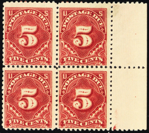 J64, Mint NH 5¢ Block of Four Postage Due Stamps SCV $130.00 - Stuart Katz