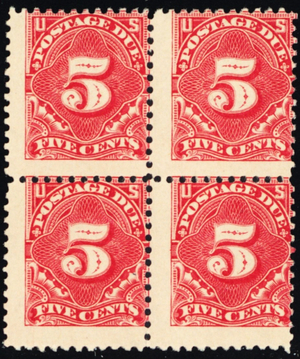 J64, Mint NH 5¢ Block of Four Postage Due Stamps SCV $130.00 * Stuart Katz