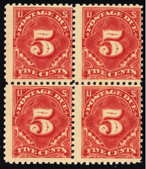 J64, Mint NH 5¢ Block of Four Postage Due Stamps SCV $130.00 -- Stuart Katz