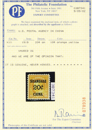 K10, Mint XF NH 20ยข Shanghai - With PFC Certificate - Stuart Katz