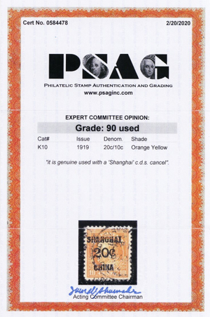 K10, Used 20¢ XF - With Graded 90 PSAG Certificate - Stuart Katz