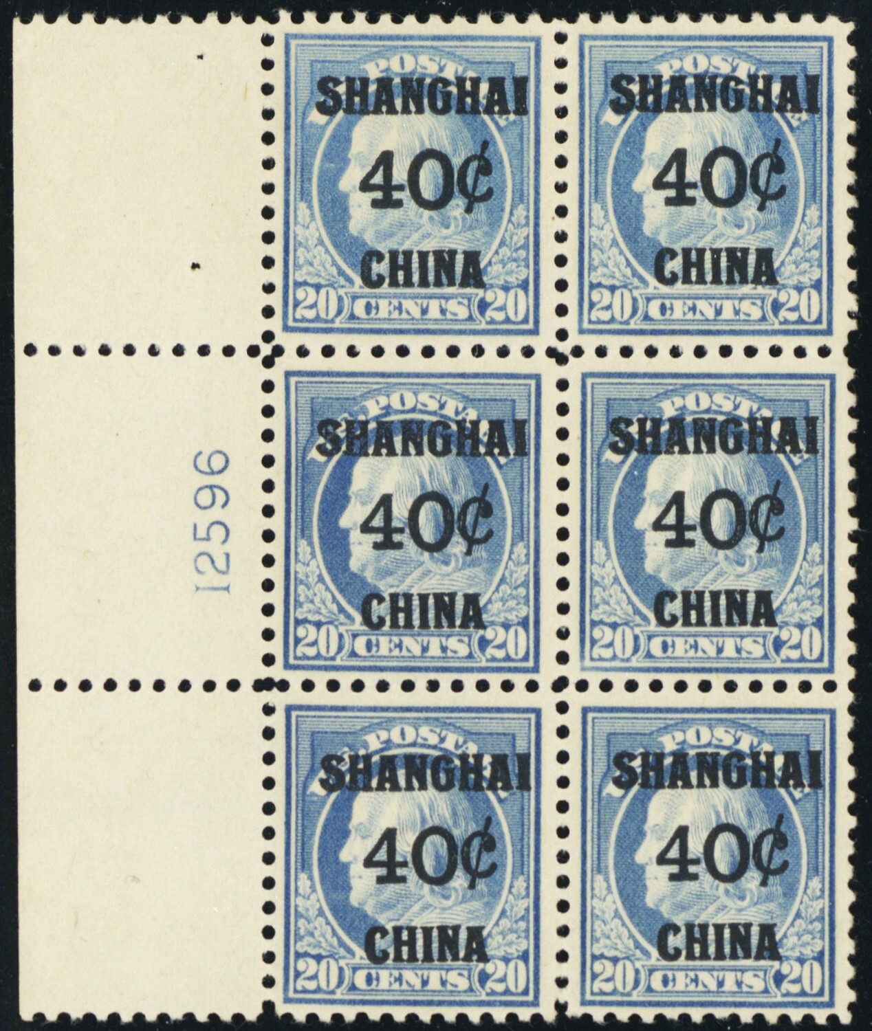 K13, Mint VF VLH 40¢ - Shanghai Plate Block of Six CV $1300 - Stuart Katz