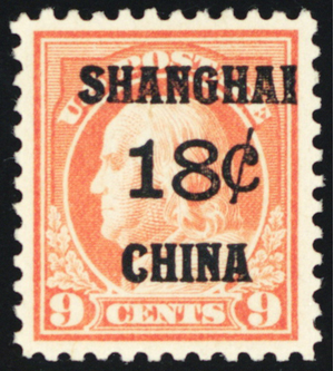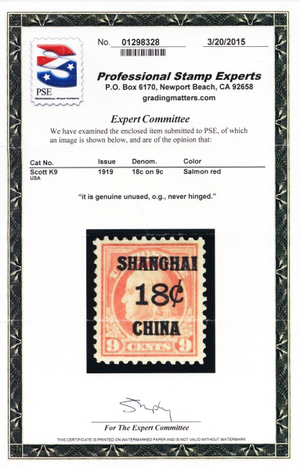 K9, Mint VF/XF NH 18¢ Shanghai - PSE Certificate - Stuart Katz