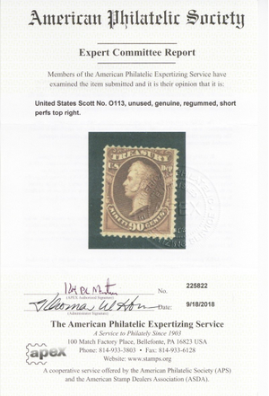 O113, Unused 90ยข RARE Official Stamp - APS Certificate SCV $5000 - Stuart Katz