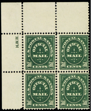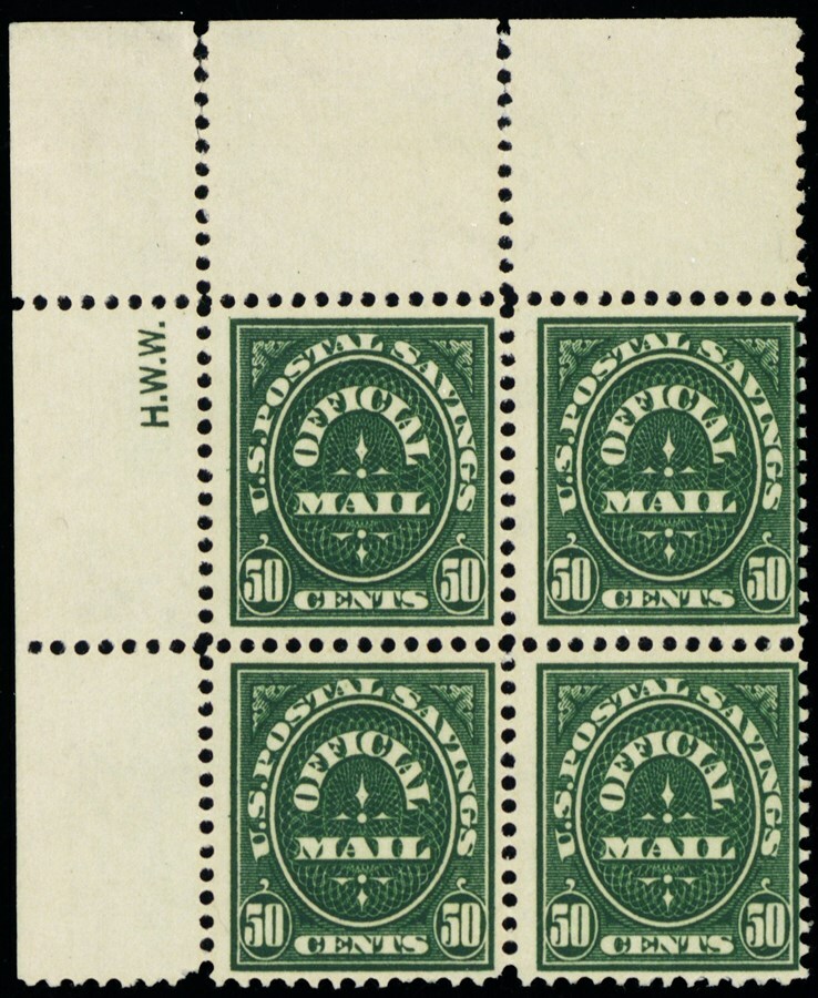 O122, Mint NH 50¢ Official Block Sideographers Initials EXT RARE! - Stuart Katz