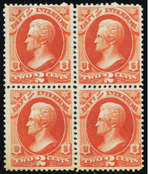 O16, Mint LH/NH 2¢ Interior Official Block SCV $470.00 - Stuart Katz