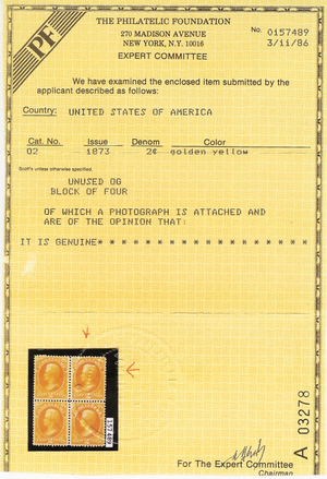 Due to the high cost of obtaining certificates we will only refund the cost of the stamp and not the cost of the certificate for stamps that sell for less than $250 that come back with a negative certificate. Stamps that sell for above $250 will receive a full refund for both the price of the stamp and cost of the certificate if it should come back not as described. For U.S. stamps only certificates from either APS, PSE or from the Philatelic Foundation are accepted, however "graded" certificates or "encased" items are not accepted.
