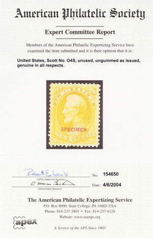O4s, Unused 6¢ Specimen Stamp - With APS Certificate * Stuart Katz