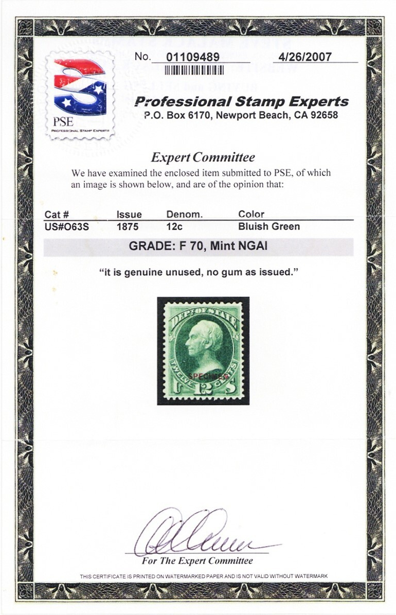 O63s, Unused (NGAI) 12¢ Specimen Stamp With PSE Cert * Stuart Katz