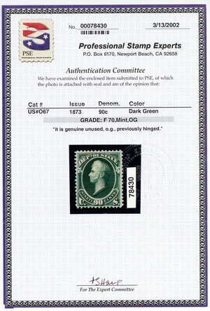 O67, Mint LH 90¢ State Depart Official With PSE Certificate CV $1100 Stuart Katz