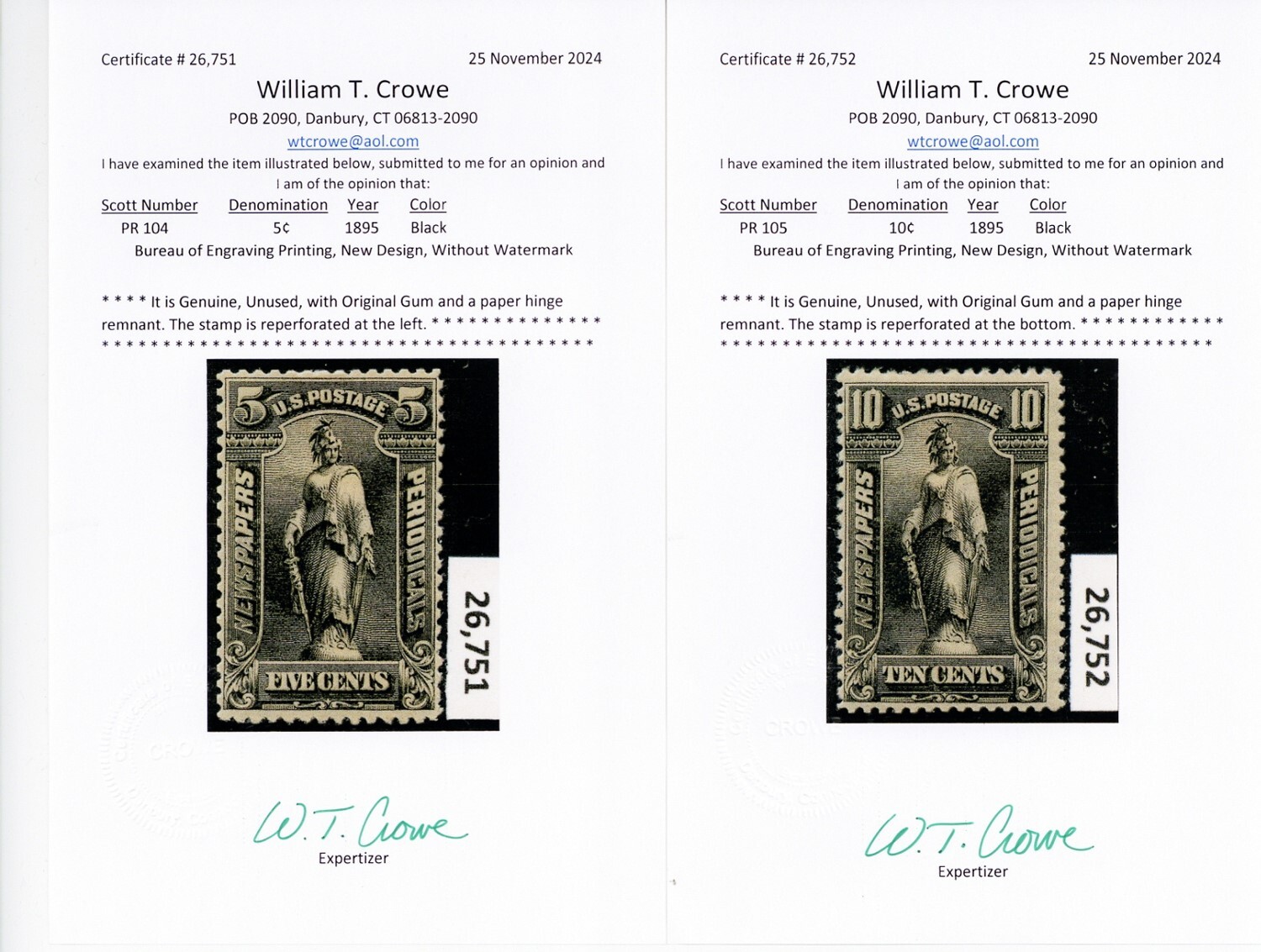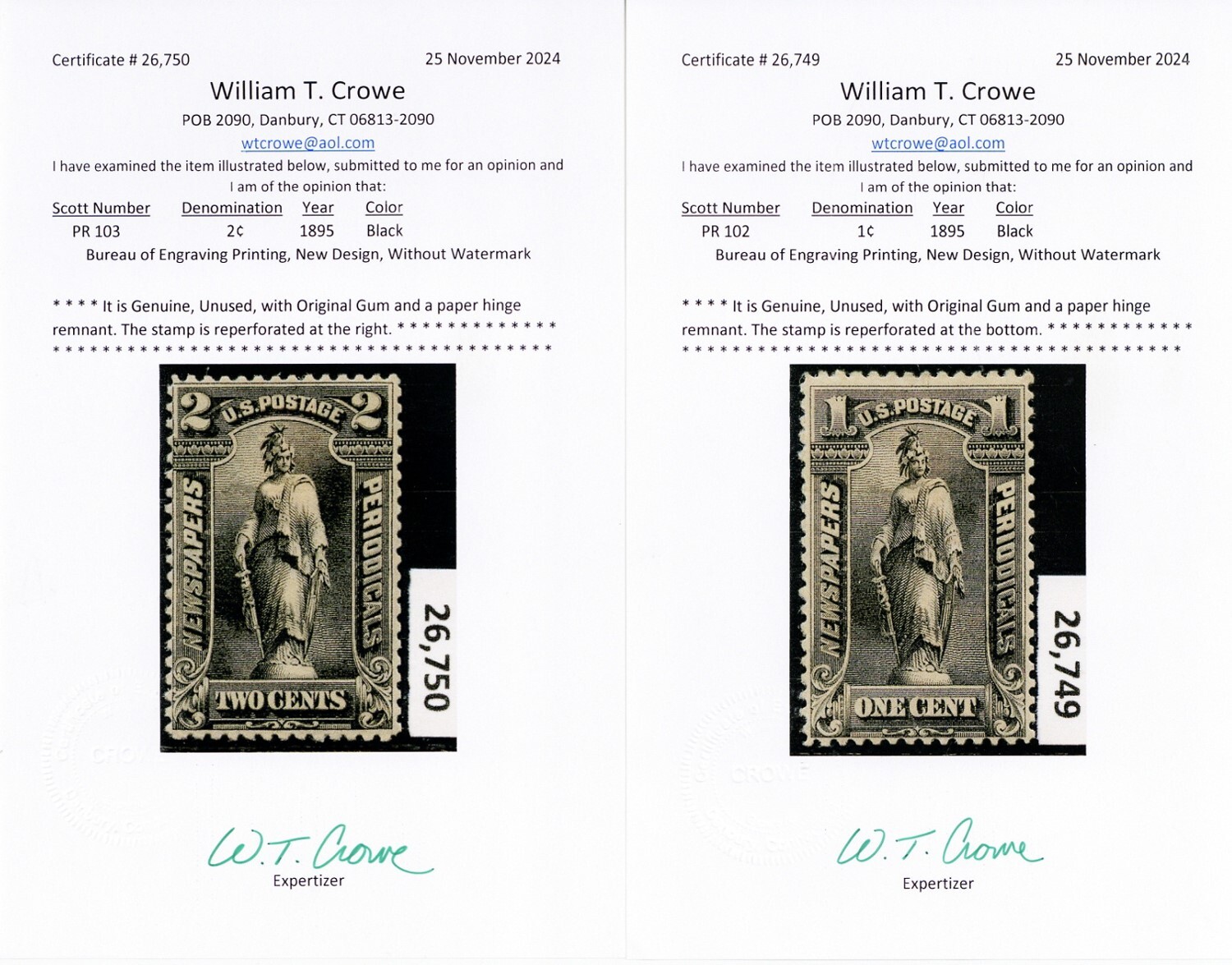 PR102-5, Mint HR RARE Newspaper Stamps With Crowe Certs SCV $1360 - Stuart Katz