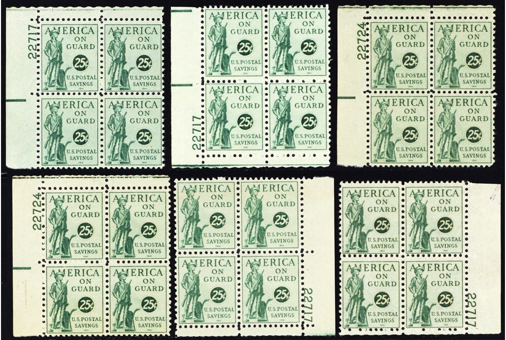 PS12, MNH F-VF NH 25¢ SIX Plate Blocks Postal Savings CV $135. - Stuart Katz