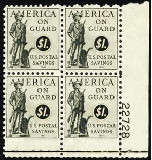 PS14, Mint NH VF $1 Plate Block of Postal Savings Stamps CV $75 ** Stuart Katz