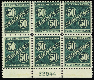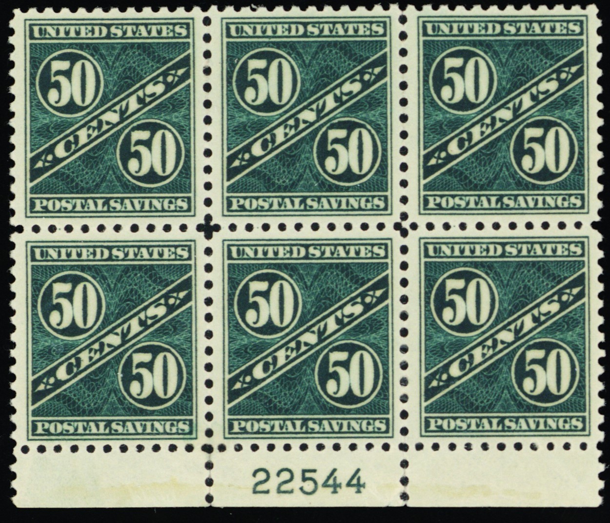 PS9, Mint NH 50¢ Plate Block of Six - Postal Savings CV $1200.00 * Stuart Katz