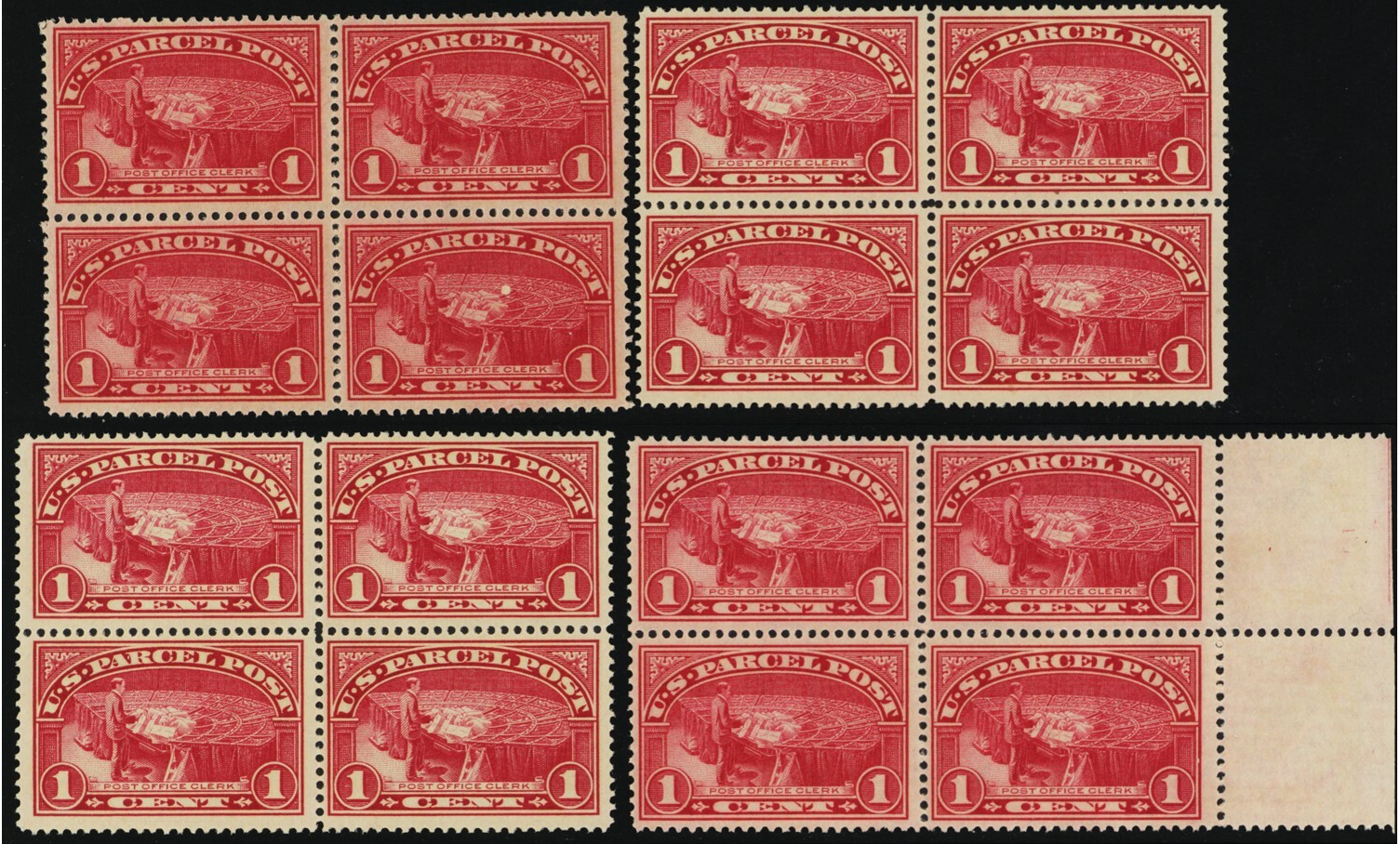 Q1, Mint NH F-VF 1¢ Parcel Post - 4 Blocks SCV $192 -- Stuart Katz