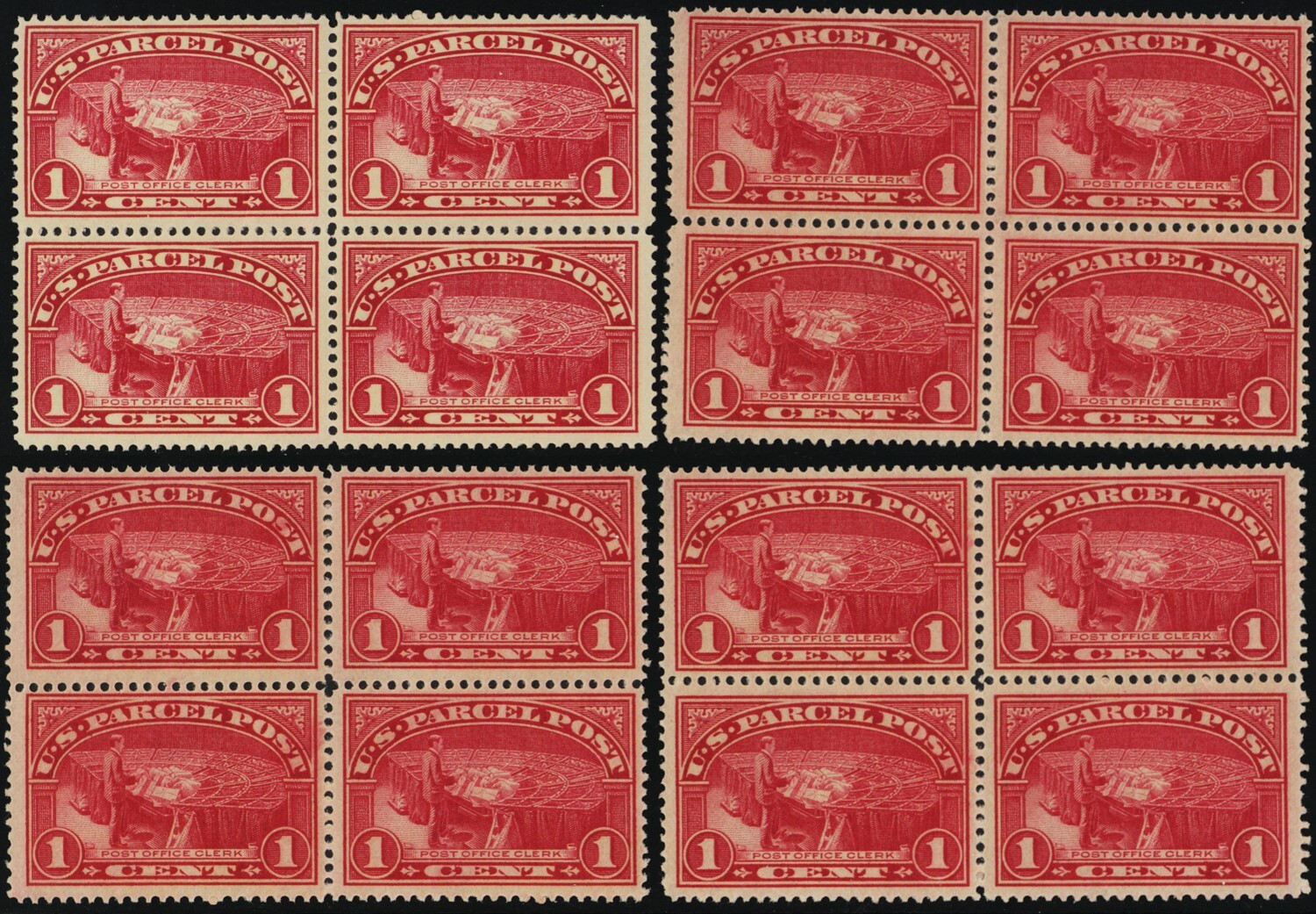Q1, Mint NH F-VF 1¢ Parcel Post - 4 Blocks SCV $192 - Stuart Katz