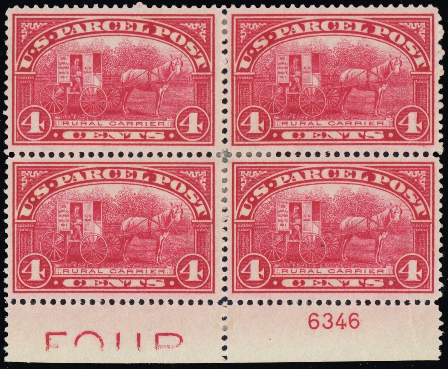 Q4 Mint F-VF HR 4¢ - Plate Block of Four Parcel Post SCV $325 - Stuart Katz