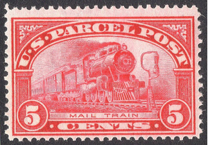 Scott #Q5 F-VF MNH OG 5-cent Parcel Post stamp depicting a Mail Train. Gum is pristine with no skips or bends.