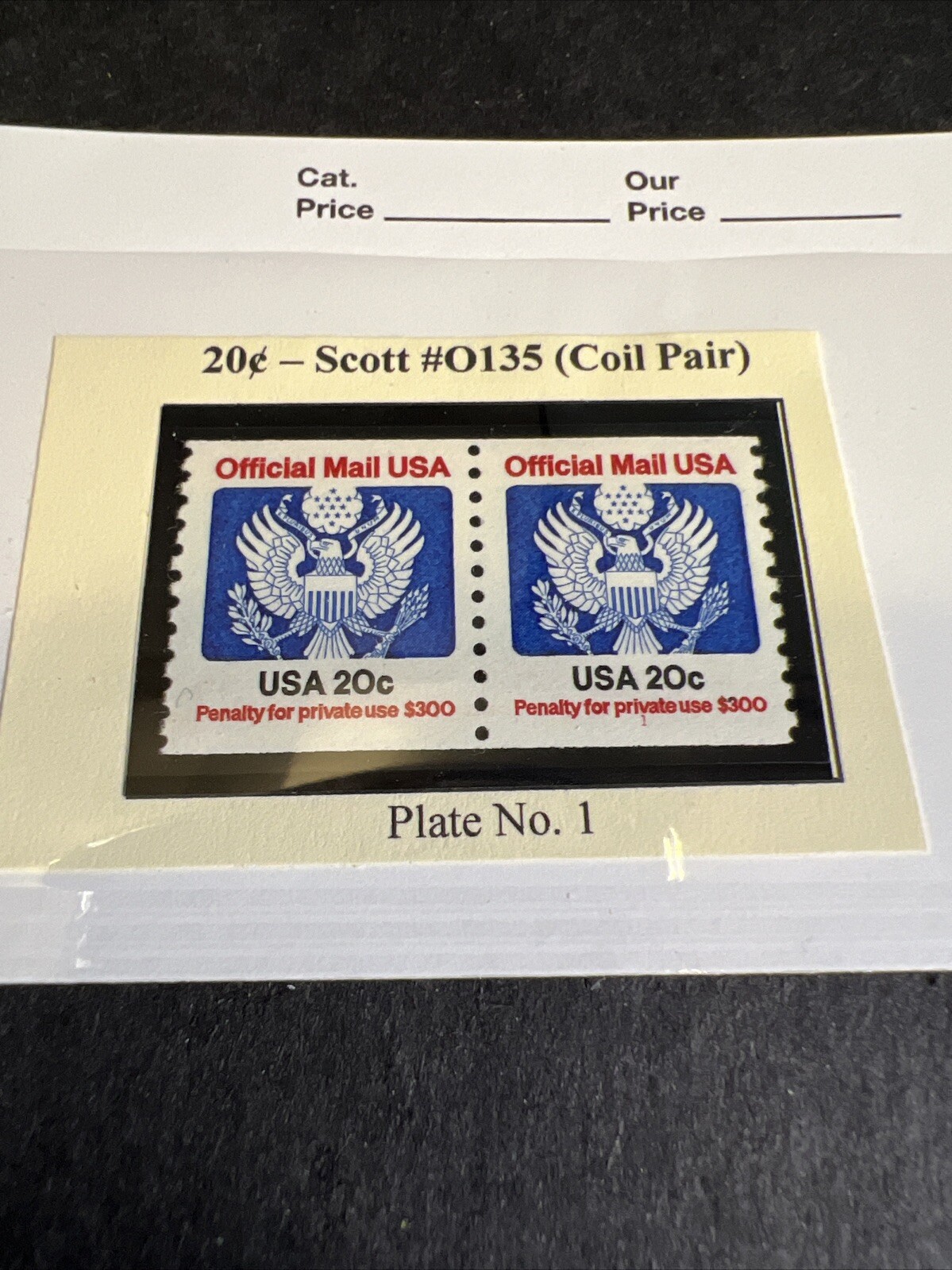 Scott#O135 MNH Pl# Pair 1993 20c Eagle Shield Arrow Stars Official Mail Coil. Shipped with USPS Ground Advantage.