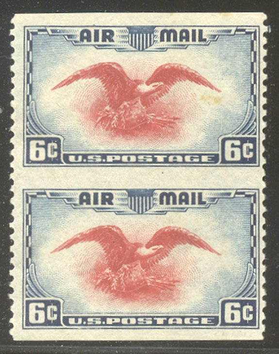 Scott #C23a: 1938 6c Dk Blue & Carmine, Imperf Between Pair Centering & Condition: Mint. Fresh. Fine Pair, Imperf Between. Reverse (Gum Side): Original gum. Lightly Hinged. Gum wrinkle. Faults / Imperfections: None The item pictured is the actual item you are purchasing, unless otherwise noted. I also offer an interest-free layaway plan. Ask me about it!" All items will be mailed a day or two after payment is received. ![]() ![]() ![]() --------------------------------------------------------------------------------