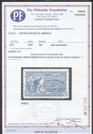 Scott #E10: 1916 10c Messenger, P10 Unwmkd Centering & Condition: Mint. Fresh. Rich color. Extremely Fine and CHOICE! Certificate mentions a small paper flaw but they are noting a tiny gum skip. Reverse (Gum Side): Original gum. Never Hinged. Faults / Imperfections: None The item pictured is the actual item you are purchasing, unless otherwise noted. I also offer an interest-free layaway plan. Ask me about it!" All items purchased will be mailed a day or two after payment is received. --------------------------------------------------------------------------------