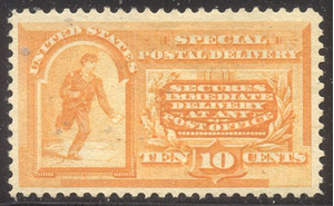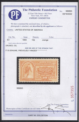 Scott #E3: 1893 10c Orange, Special Delivery Centering & Condition: Mint. Fresh. Very Fine. A Foundation certificate accompanies. Reverse (Gum Side): Original gum. Lightly Hinged. Backstamped. Faults / Imperfections: None The item pictured is the actual item you are purchasing, unless otherwise noted. I also offer an interest-free layaway plan. Ask me about it!" All items purchased will be mailed a day or two after payment is received. --------------------------------------------------------------------------------