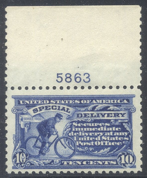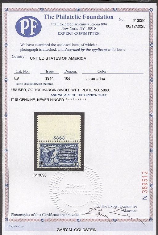 Scott #E9: 1914 10c Messenger, SLW Centering & Condition: Mint. Fresh. Rich color. Very Fine. A Foundation certificate accompanies. Reverse (Gum Side): Original gum. Never Hinged. Faults / Imperfections: None The item pictured is the actual item you are purchasing, unless otherwise noted. I also offer an interest-free layaway plan. Ask me about it!" All items will be mailed a day or two after payment is received. ![]() ![]() ![]() --------------------------------------------------------------------------------