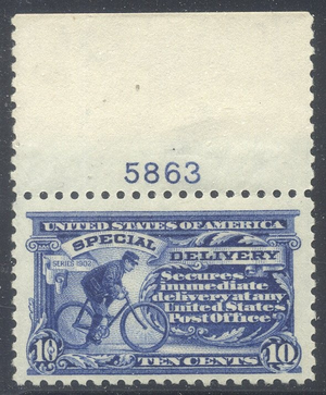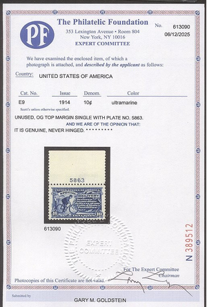 Scott #E9: 1914 10c Messenger, SLW Centering & Condition: Mint. Fresh. Rich color. Very Fine. A Foundation certificate accompanies. Reverse (Gum Side): Original gum. Never Hinged. Faults / Imperfections: None The item pictured is the actual item you are purchasing, unless otherwise noted. I also offer an interest-free layaway plan. Ask me about it!" All items will be mailed a day or two after payment is received. --------------------------------------------------------------------------------