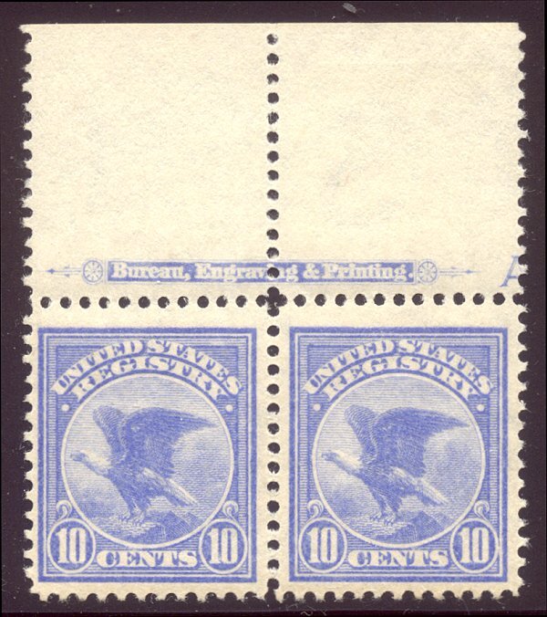 Scott #F1: 1911 10c Registry Stamp Centering & Condition: Mint. Fresh. Rich color. VF/XF Imprint Pair. Reverse (Gum Side): Original gum. Never Hinged. Faults / Imperfections: None The item pictured is the actual item you are purchasing, unless otherwise noted. I also offer an interest-free layaway plan. Ask me about it!" All items will be mailed a day or two after payment is received. --------------------------------------------------------------------------------