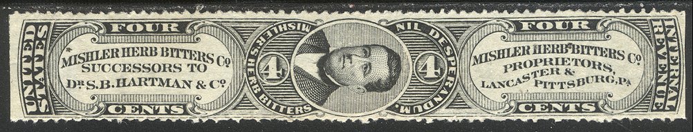 Scott #RS181p: 4c Mishler Herb Bitters, Imperf at ends Centering & Condition: Unused. Fine and SCARCE. Reverse (Gum Side): Without gum Faults / Imperfections: Couple small thins The item pictured is the actual item you are purchasing, unless otherwise noted. I also offer an interest-free layaway plan. Ask me about it!" All items will be mailed a day or two after payment is received. ![]() ![]() ![]() --------------------------------------------------------------------------------