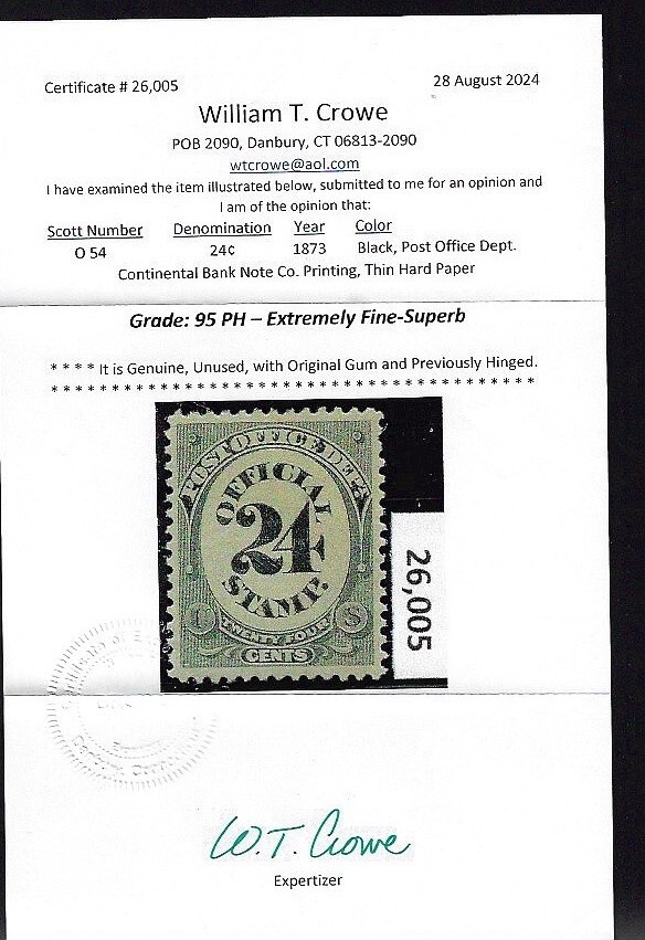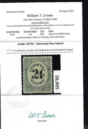 WCstamps: U.S. Scott #O54 24c XF/SUP Mint OGph 2024 Crowe Cert SMQ $475