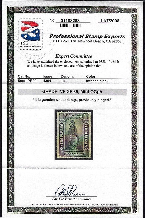 WCstamps: U.S. Scott #PR90 1c Newspaper VF/XF Mint OGph 2008 PSE Cert SMQ $810