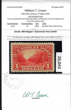 WCstamps: U.S. Scott #Q12 $1 Parcel Post XF Mint OGh 2024 Crowe Cert SMQ $515