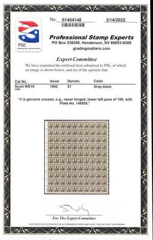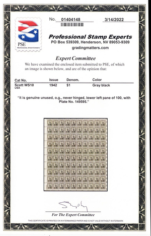 WS10, MNH $1 War Savings Complete Sheet of 100 PSE SCV $1330 - Stuart Katz