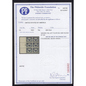 U.S. #C6 Mint NH Plate Block BEAUTY - 1923 24c DeHavilland