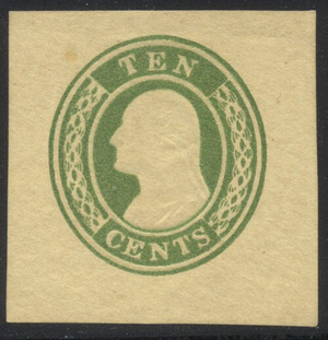 Scott #U16: 10c Green on Buff Centering & Condition: Unused. Very Fine cut square. Reverse (Gum Side): N/A Faults / Imperfections: Faint spot at upper left The item pictured is the actual item you are purchasing, unless otherwise noted. I also offer an interest-free layaway plan. Ask me about it!" All items purchased will be mailed a day or two after payment is received. --------------------------------------------------------------------------------