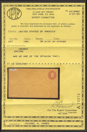 Scott #U37: 3c Pink on Orange Centering & Condition: Mint. Fresh. Very Fine and RARE Entire Reverse (Gum Side): N/A Faults / Imperfections: None The item pictured is the actual item you are purchasing, unless otherwise noted. I also offer an interest-free layaway plan. Ask me about it!" All items will be mailed a day or two after payment is received. --------------------------------------------------------------------------------