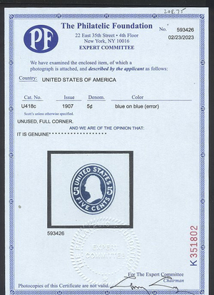 Scott #U418c: 5c Blue on Blue Error Centering & Condition: Unused. Extremely Fine and RARE Error. Reverse (Gum Side): N/A Faults / Imperfections: Negligible paper speck mentioned for accuracy The item pictured is the actual item you are purchasing, unless otherwise noted. I also offer an interest-free layaway plan. Ask me about it!" All items will be mailed a day or two after payment is received. --------------------------------------------------------------------------------