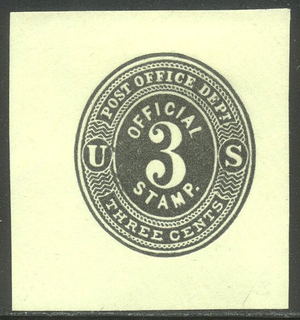 Scott #UO9: 3c Black on Amber Centering & Condition: Unused. Very Fine cut square. Reverse (Gum Side): N/A Faults / Imperfections: None The item pictured is the actual item you are purchasing, unless otherwise noted. I also offer an interest-free layaway plan. Ask me about it!" All items purchased will be mailed a day or two after payment is received. --------------------------------------------------------------------------------