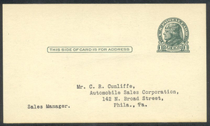 Scott #UX27D: 1916 1c Dark Green, Die II Centering & Condition: Unused (Pre-printed). Very Fine and SCARCE Postal Card. Reverse (Gum Side): N/A Faults / Imperfections: None The item pictured is the actual item you are purchasing, unless otherwise noted. I also offer an interest-free layaway plan. Ask me about it!" All items will be mailed a day or two after payment is received. -------------------------------------------------------------------------------- Please click any of the following to read: |