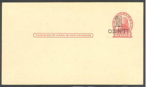 Scott #UX33 (UPSS S45-37b): 1c on 2c Carmine, Dbl Ovpt Centering & Condition: Mint. Very Fine Postal Cards. Reverse (Gum Side): N/A Faults / Imperfections: None The item pictured is the actual item you are purchasing, unless otherwise noted. I also offer an interest-free layaway plan. Ask me about it!" All items will be mailed a day or two after payment is received. --------------------------------------------------------------------------------