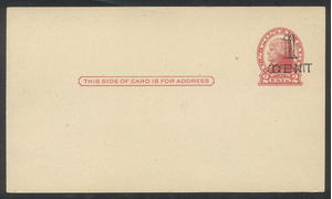 Scott #UX33b: 1c on 2c Red, Dbl Surcharge Centering & Condition: Mint. Fresh. Very Fine and SCARCE. Reverse (Gum Side): N/A Faults / Imperfections: None The item pictured is the actual item you are purchasing, unless otherwise noted. I also offer an interest-free layaway plan. Ask me about it!" All items will be mailed a day or two after payment is received. --------------------------------------------------------------------------------