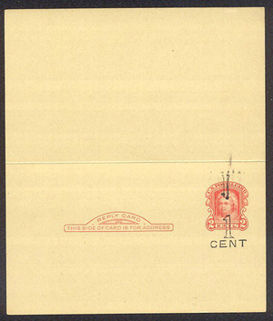 Scott #UY9: 1c on 2c Surcharge Centering & Condition: Mint. Very Fine folded Message-Reply card with a host of problems! Reverse (Gum Side): N/A Faults / Imperfections: None The item pictured is the actual item you are purchasing, unless otherwise noted. I also offer an interest-free layaway plan. Ask me about it!" All items will be mailed a day or two after payment is received. -------------------------------------------------------------------------------- Please click any of the following to read: |