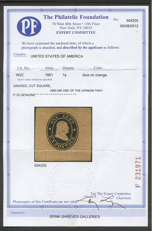 Scott #W22: 1c Blue on Orange Centering & Condition: Mint. Very Fine and RARE Cut Square. Reverse (Gum Side): N/A Faults / Imperfections: None The item pictured is the actual item you are purchasing, unless otherwise noted. I also offer an interest-free layaway plan. Ask me about it!" All items will be mailed a day or two after payment is received. --------------------------------------------------------------------------------