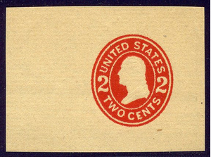 Scott #W415c: 2c Carmine, Die 7 Centering & Condition: Unused. Extremely Fine. Scarce type. Reverse (Gum Side): N/A Faults / Imperfections: None The item pictured is the actual item you are bidding on, unless otherwise noted. All items will be mailed a day or two after payment is received. -------------------------------------------------------------------------------- Please click any of the following to read: |
