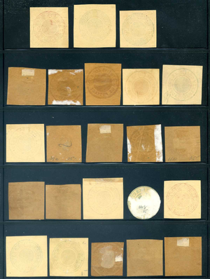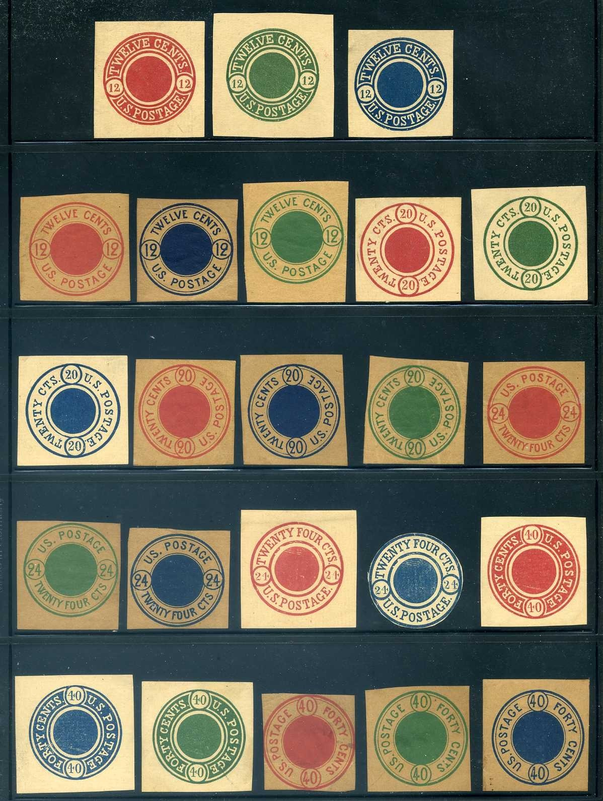 This is a very rare group of these essays, a quantity I've never encountered in over 30 years of selling stamps. Typically, these essays are found only as singles. The collection is notable for its completeness and includes a few examples that are gummed. Please refer to the scans for details on a few pieces that have creases. This is a unique opportunity, as I doubt I will ever find this many different essays together again.