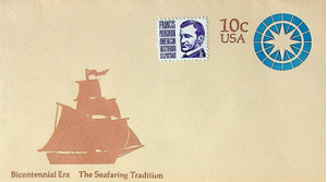The envelope has the phrases "Bicentennial Era", "The Seafaring Tradition" and a sailing ship on the front; there is also an embossed mariner's compass in the upper right corner.  A 3-cent stamp honors American historian Francis Parkman.  The back of the envelope has a small area with brown discoloration.