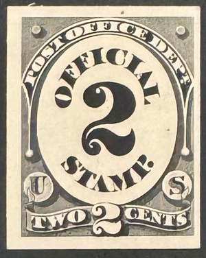 This listing is for an authentic 2¢ Official Stamp plate proof from the 1873 U.S. Post Office Department series. The proof is printed on thick card stock, as issued in BEP proof sets and archivals.