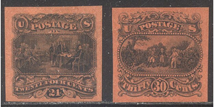 Scott #120-E2c & 121-E1p: 1869 24c-30 Black on Light Red Centering & Condition: Very Fine Essays. Reverse (Gum Side): N/A Faults / Imperfections: None The item pictured is the actual item you are purchasing, unless otherwise noted. I also offer an interest-free layaway plan. Ask me about it!" All items will be mailed a day or two after payment is received. ![]() ![]() ![]() --------------------------------------------------------------------------------